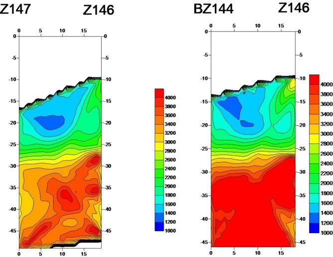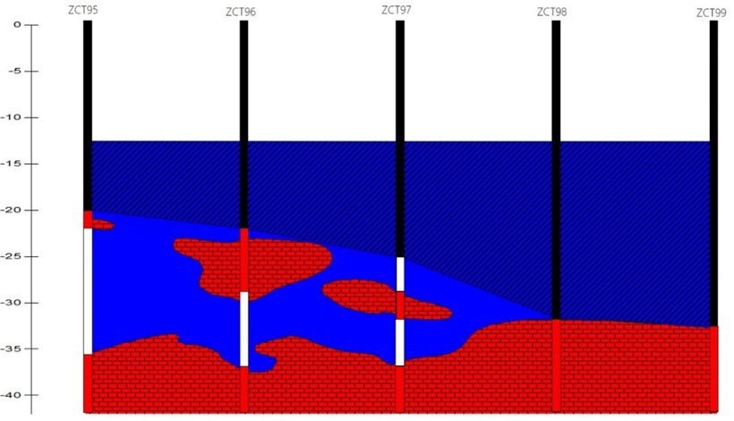 CBCT跨孔地震CT是一种可靠性好、图像直观的工程物探技术。一个钻孔激发,另一个钻孔接收,利用地震波穿透弹性介质的走时,对介质的波速分布成像。波速直接反映岩土介质的物理力学属性,与岩性、风化层度、构造破碎程度有关。完整密实岩体、孤石,弹性模量高,对应的波速高;松散体、岩溶、断裂破碎带等波速低;