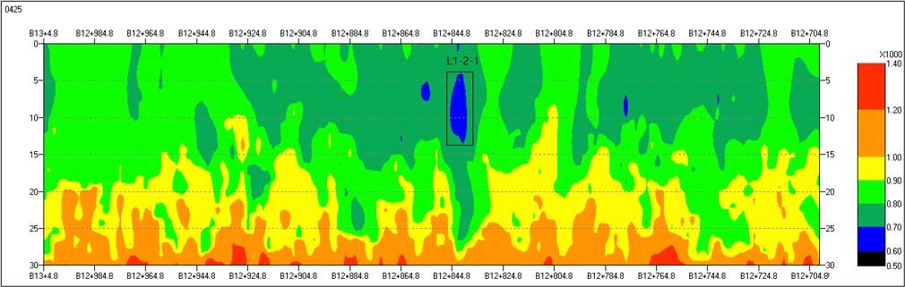 测线内发现一处蓝色低速疏松区,波速在600-700m/s,推断为疏松区,命名为L1-2-1。宽度在4-5m,埋深在5-12m范围。未发现空洞与脱空区。
