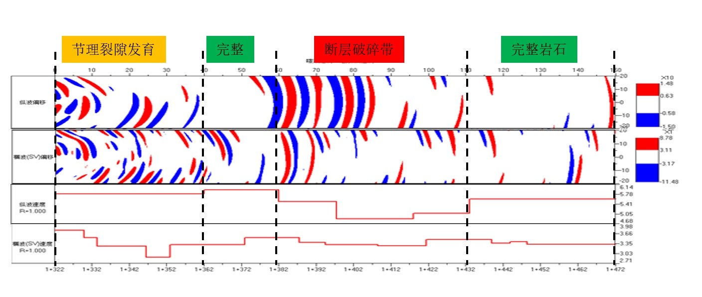 波速图像反映围岩强度随里程的分布。高波速对应岩体坚硬,强度高,密实完整;低波速对应岩体疏松软弱、破碎、断裂与裂隙发育;